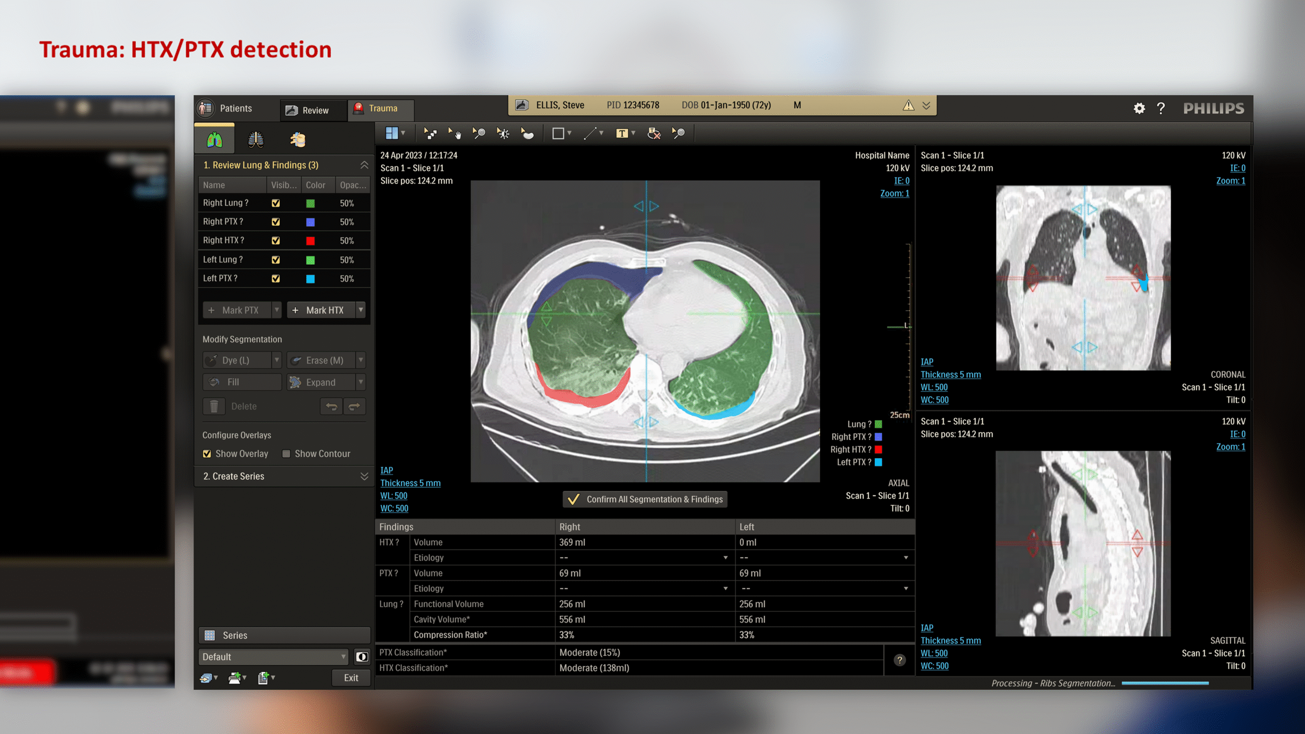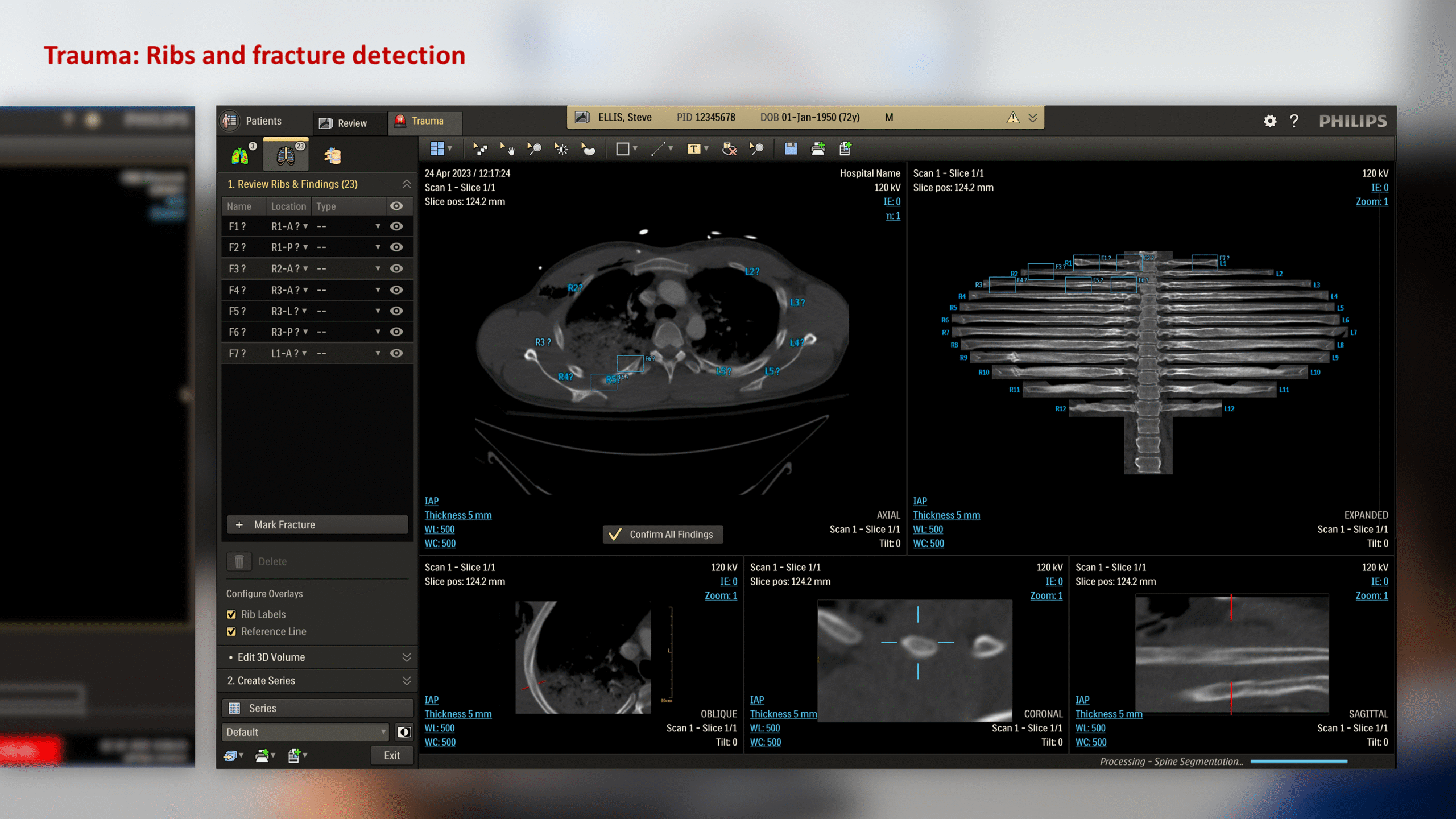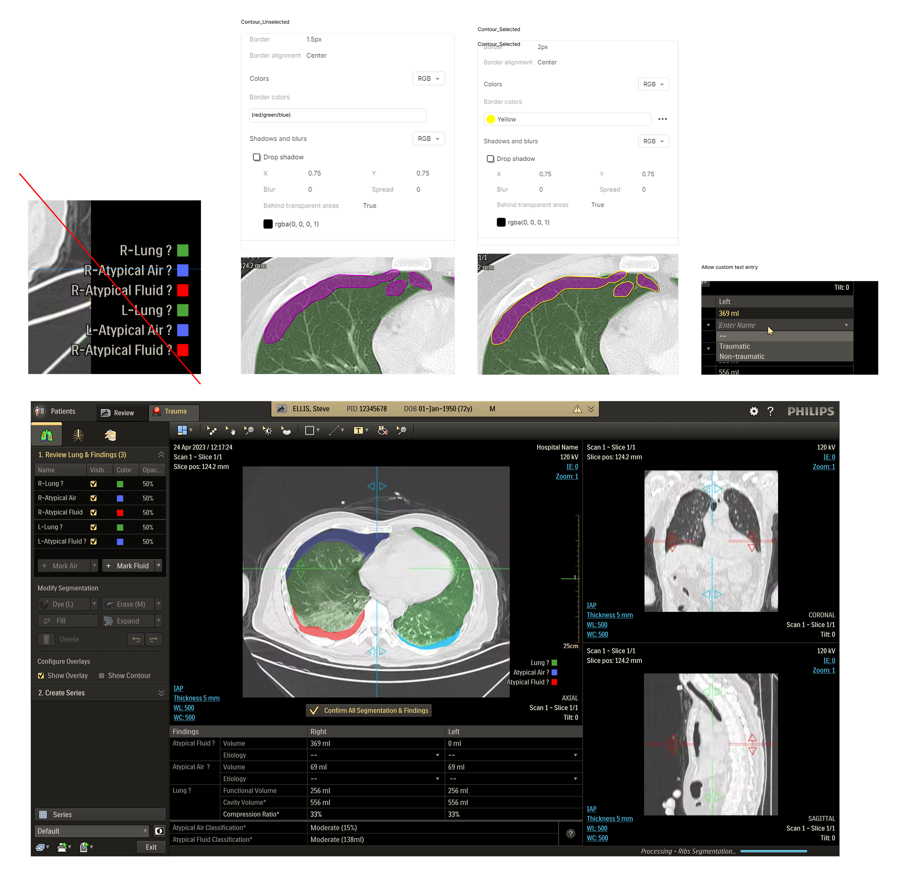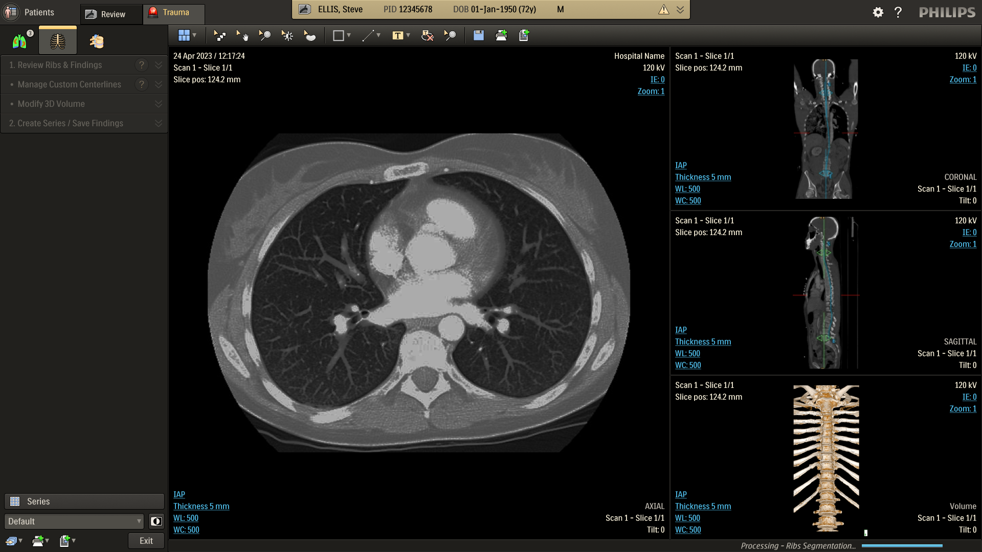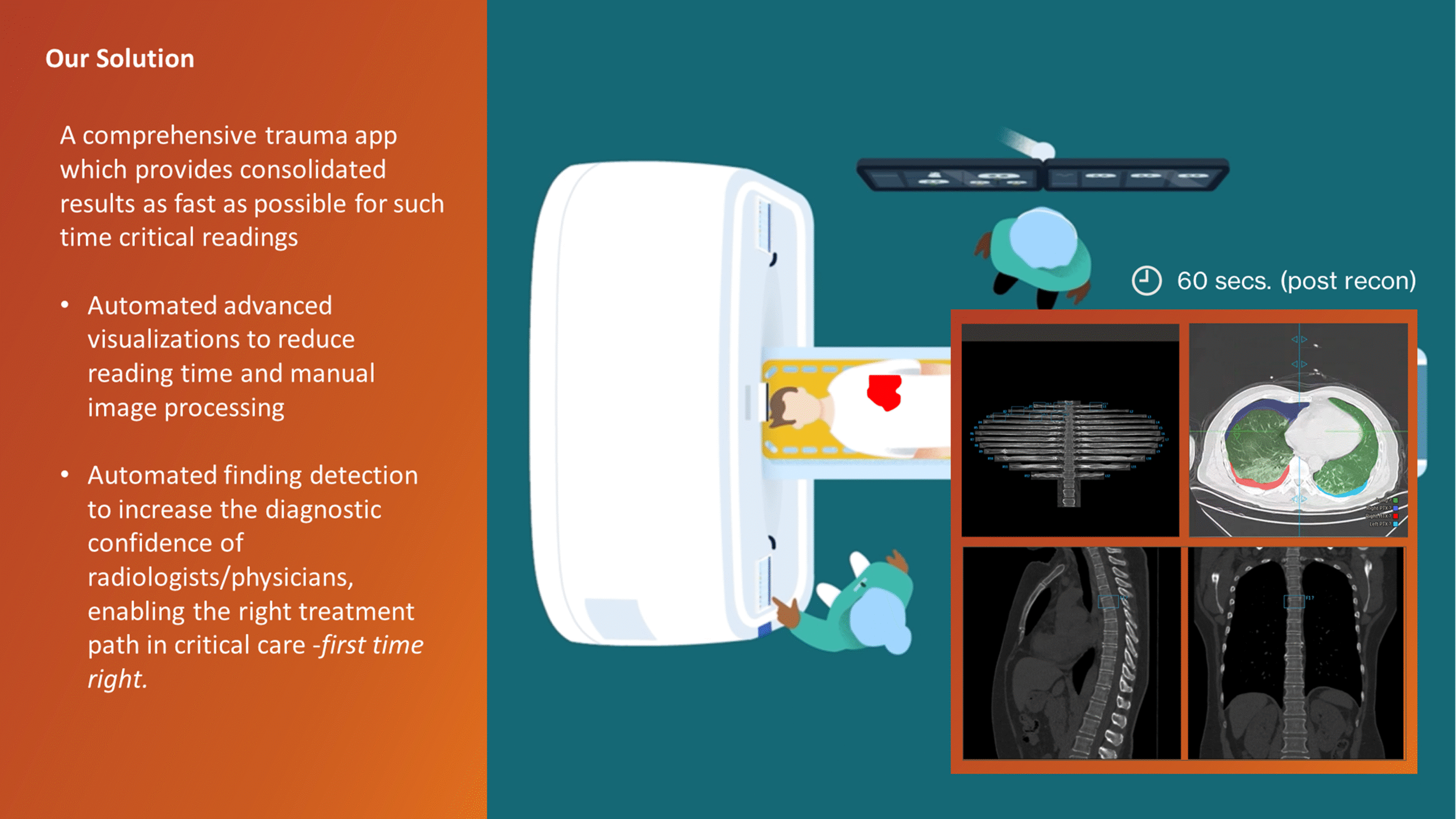The CT Trauma app, built on this process, is meant to accelerate scan reading by auto-generating specialized visuals, labels, and findings, enabling emergency teams to quickly detect critical injuries and start life-saving treatment. The initial version was planned to offer three modules, covering Lung, Ribs, and Spine.