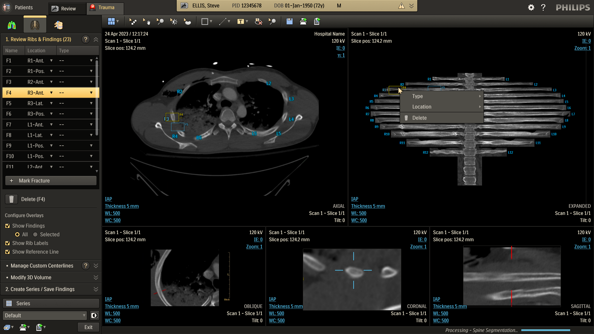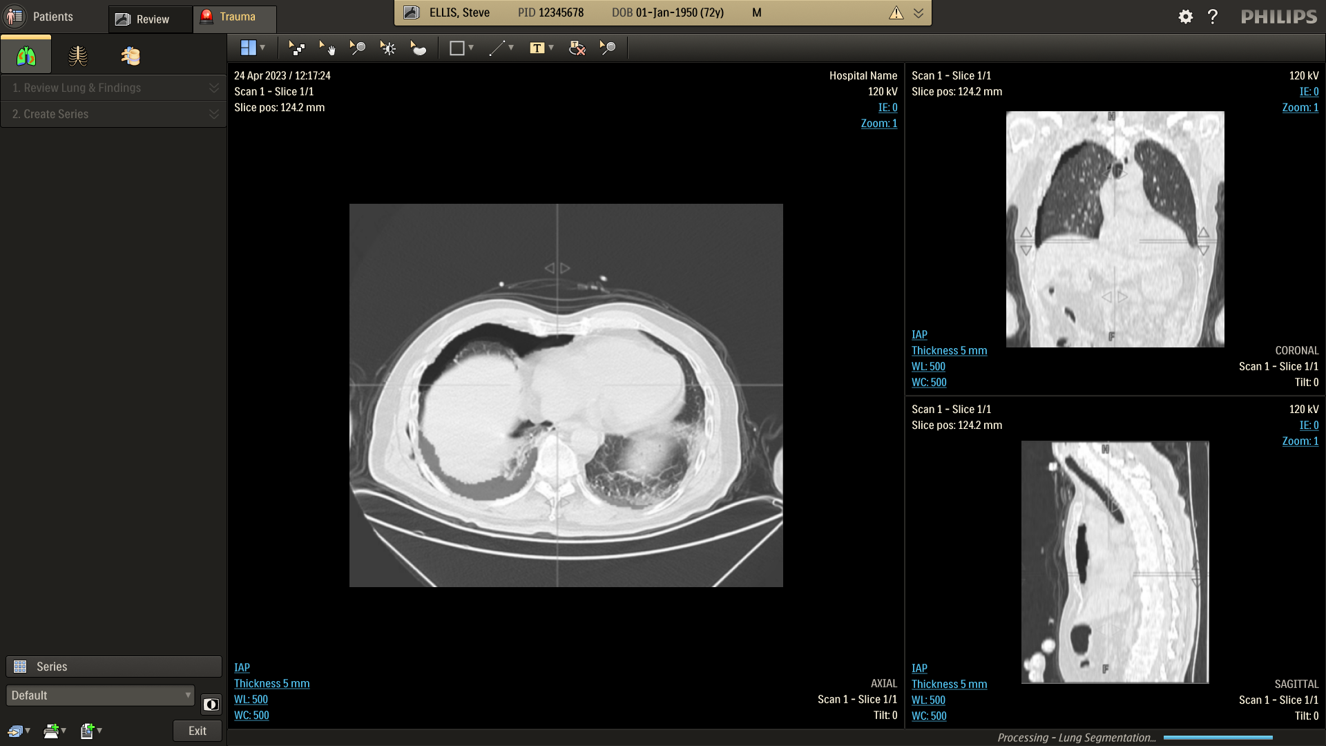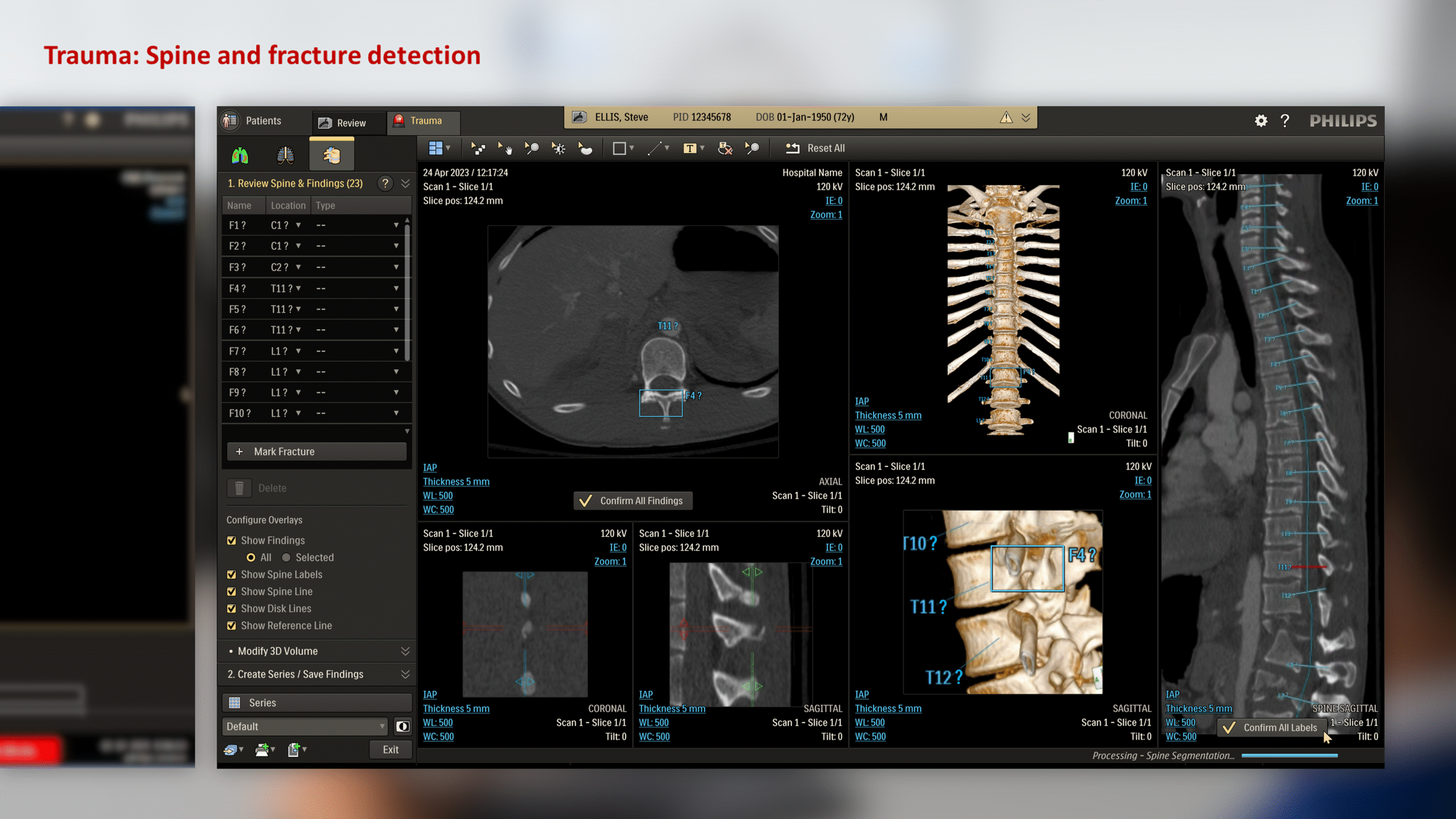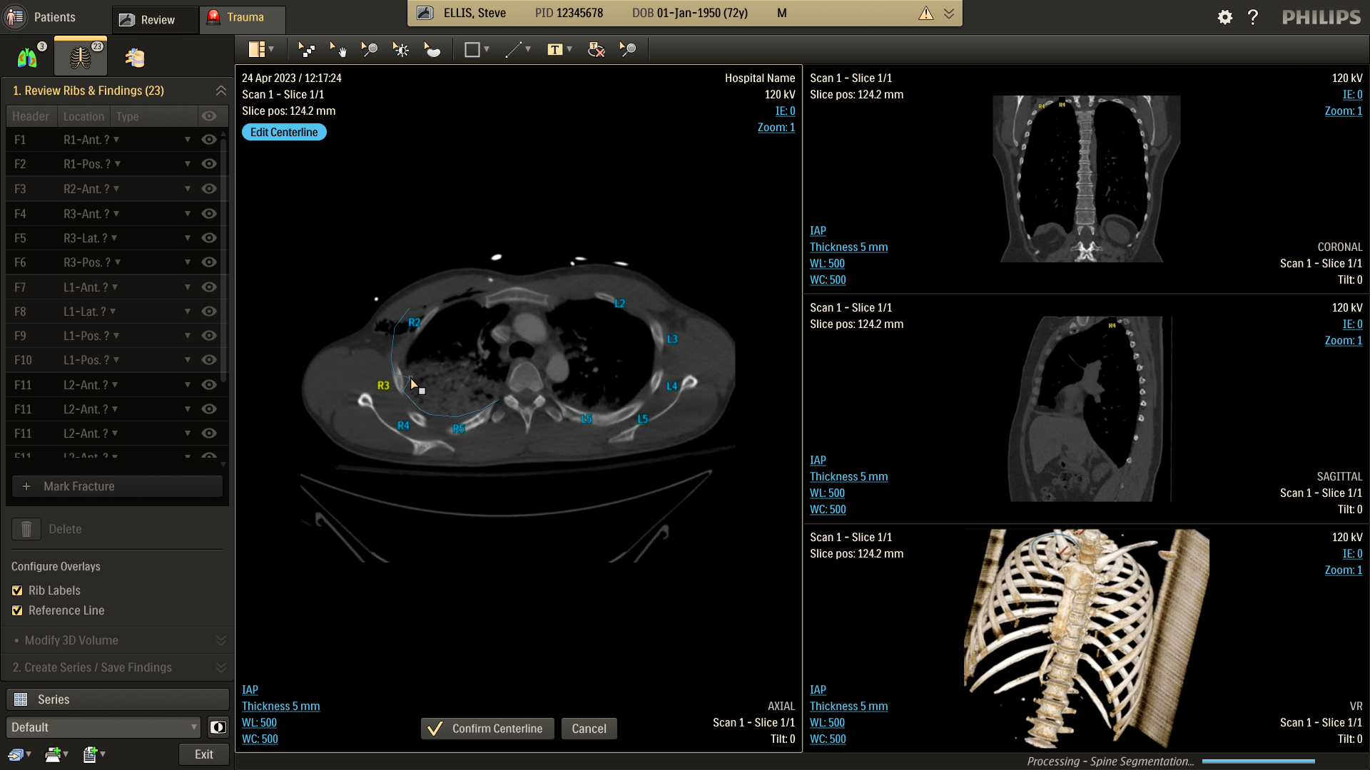 The CT Trauma app, built on this process, is meant to accelerate scan reading by auto-generating specialized visuals, labels, and findings, enabling emergency teams to quickly detect critical injuries and start life-saving treatment. The initial version was planned to offer three modules, covering Lung, Ribs, and Spine.