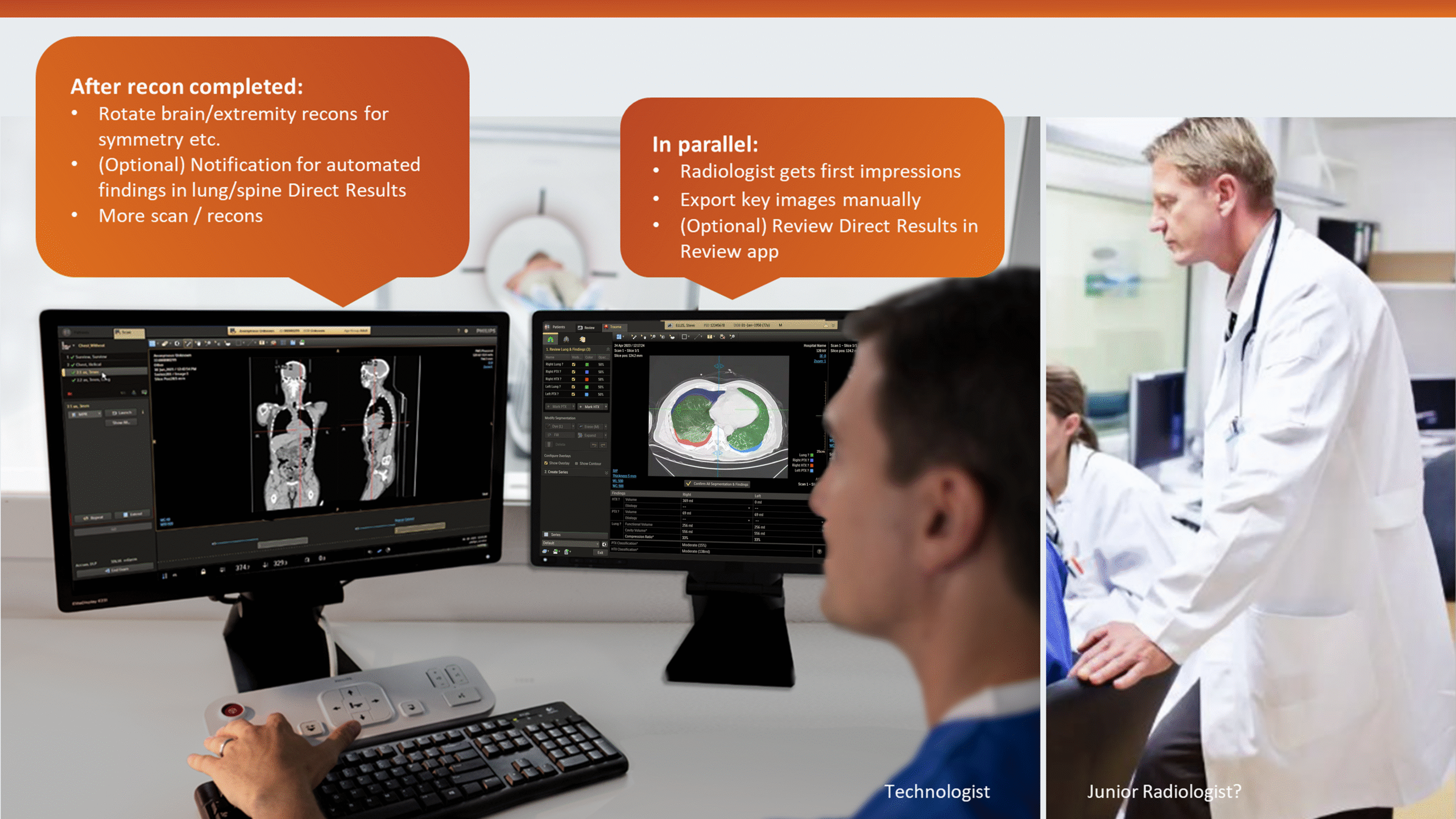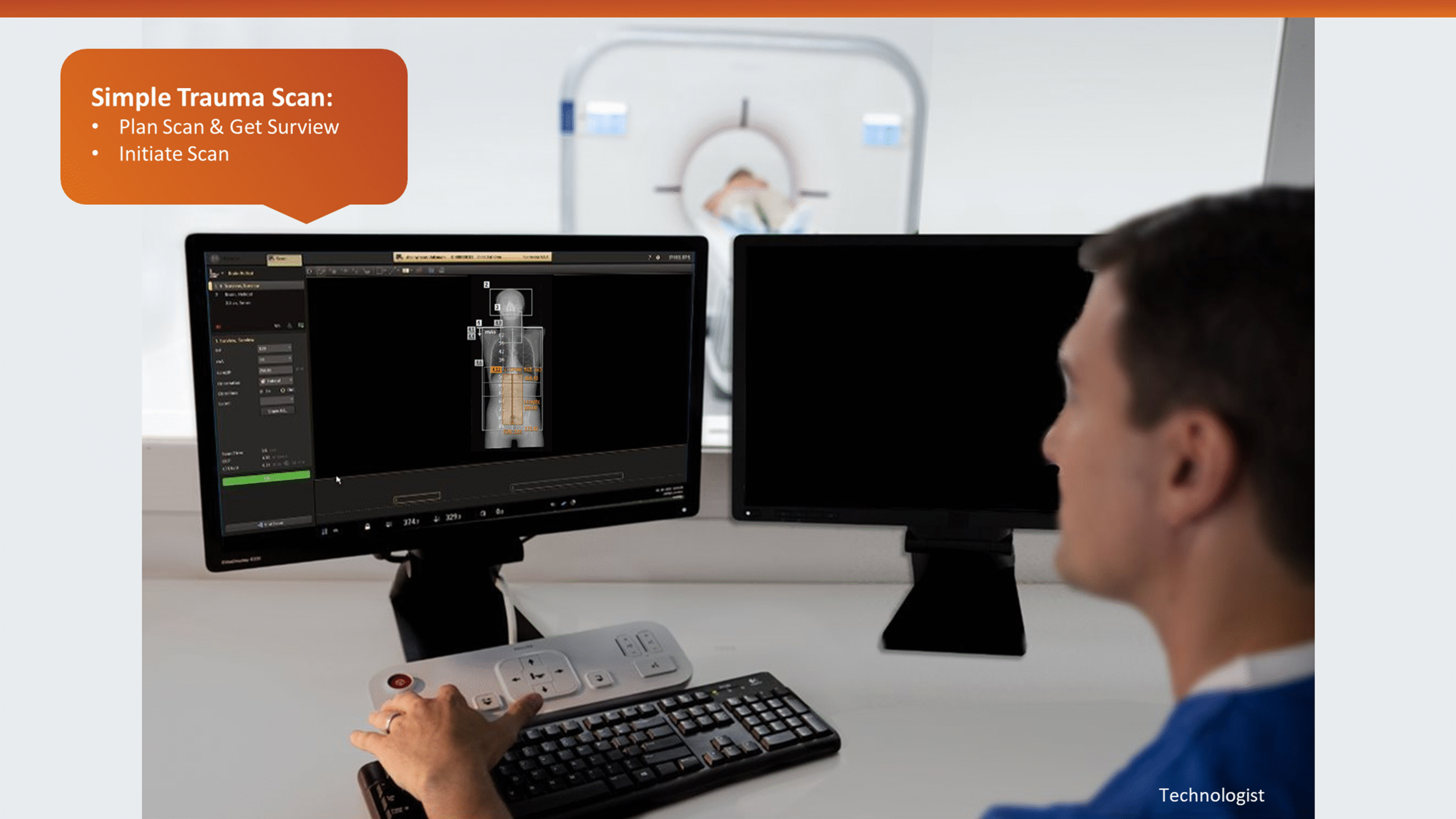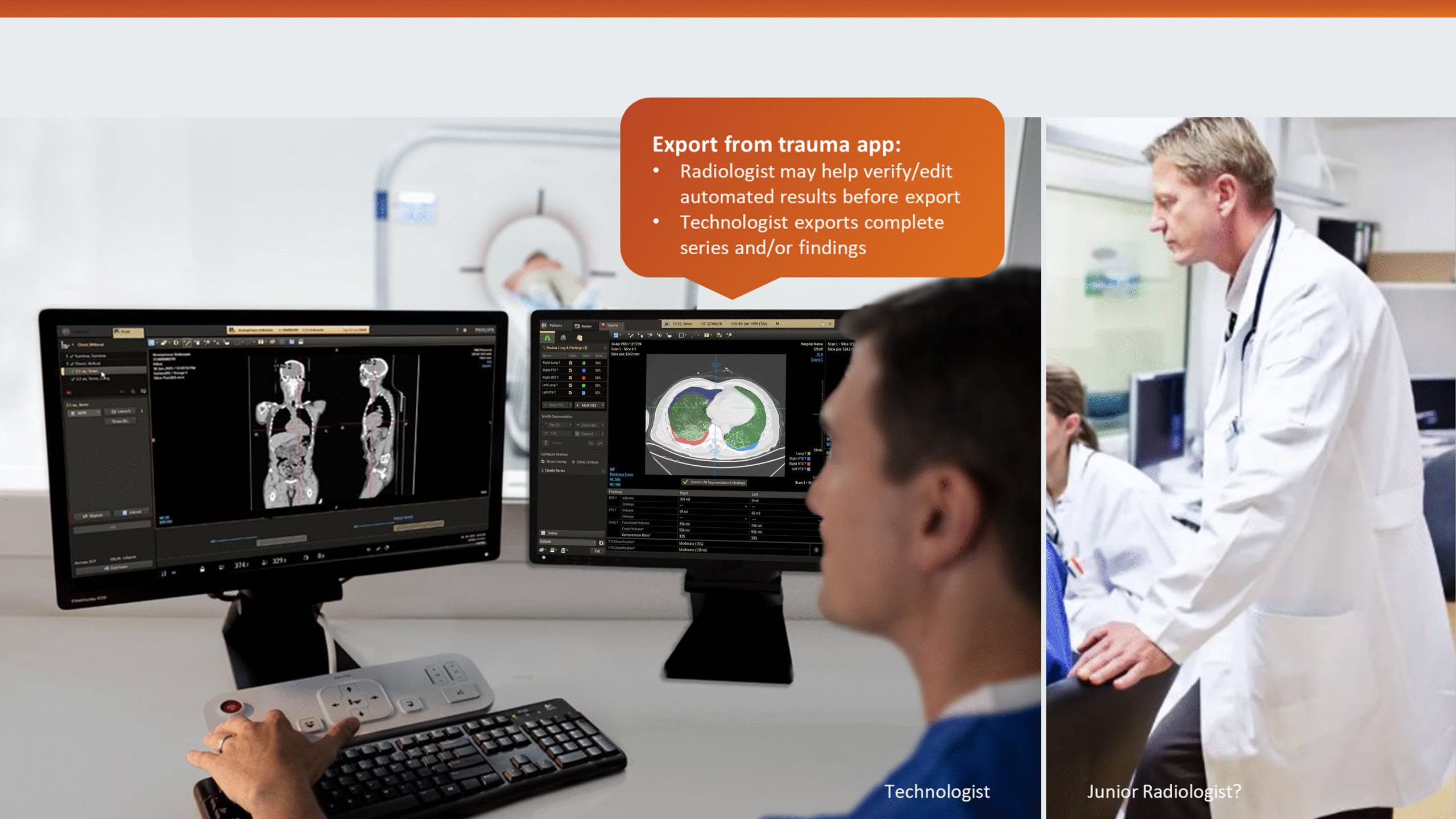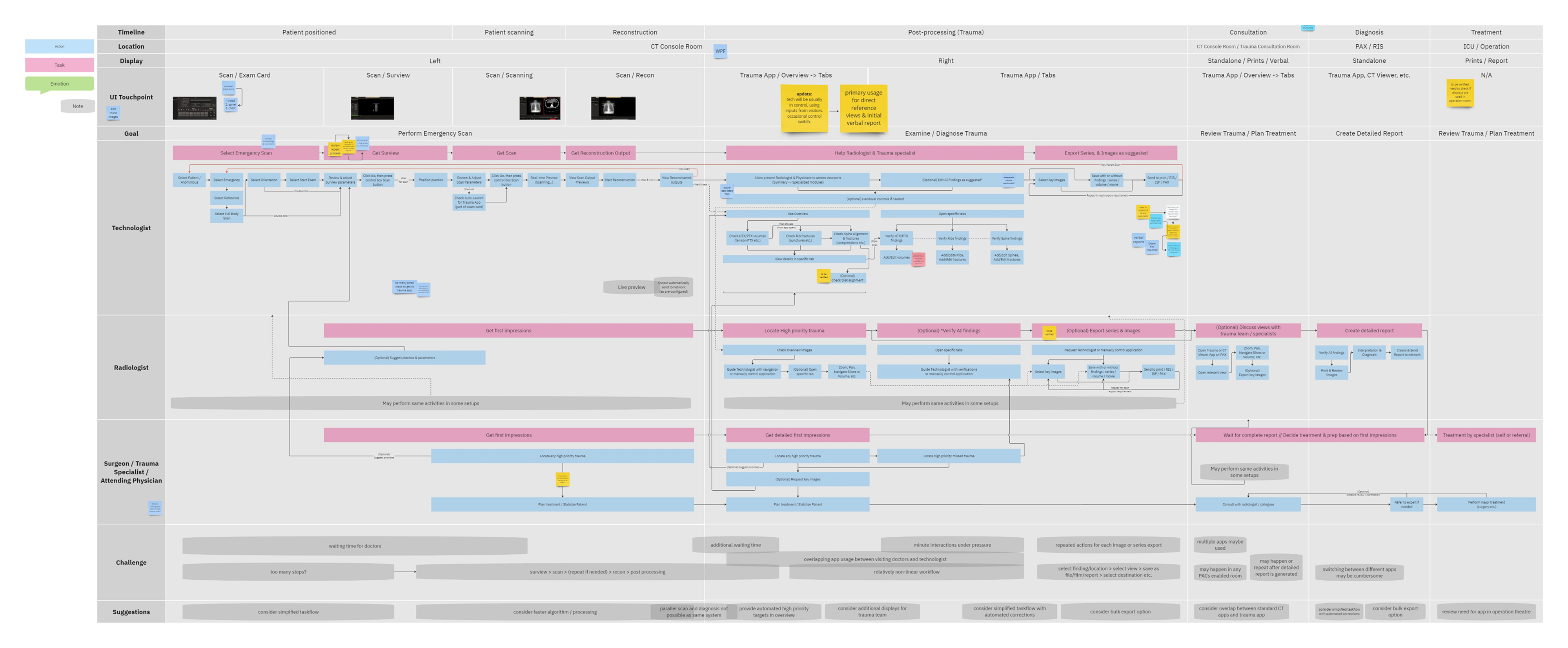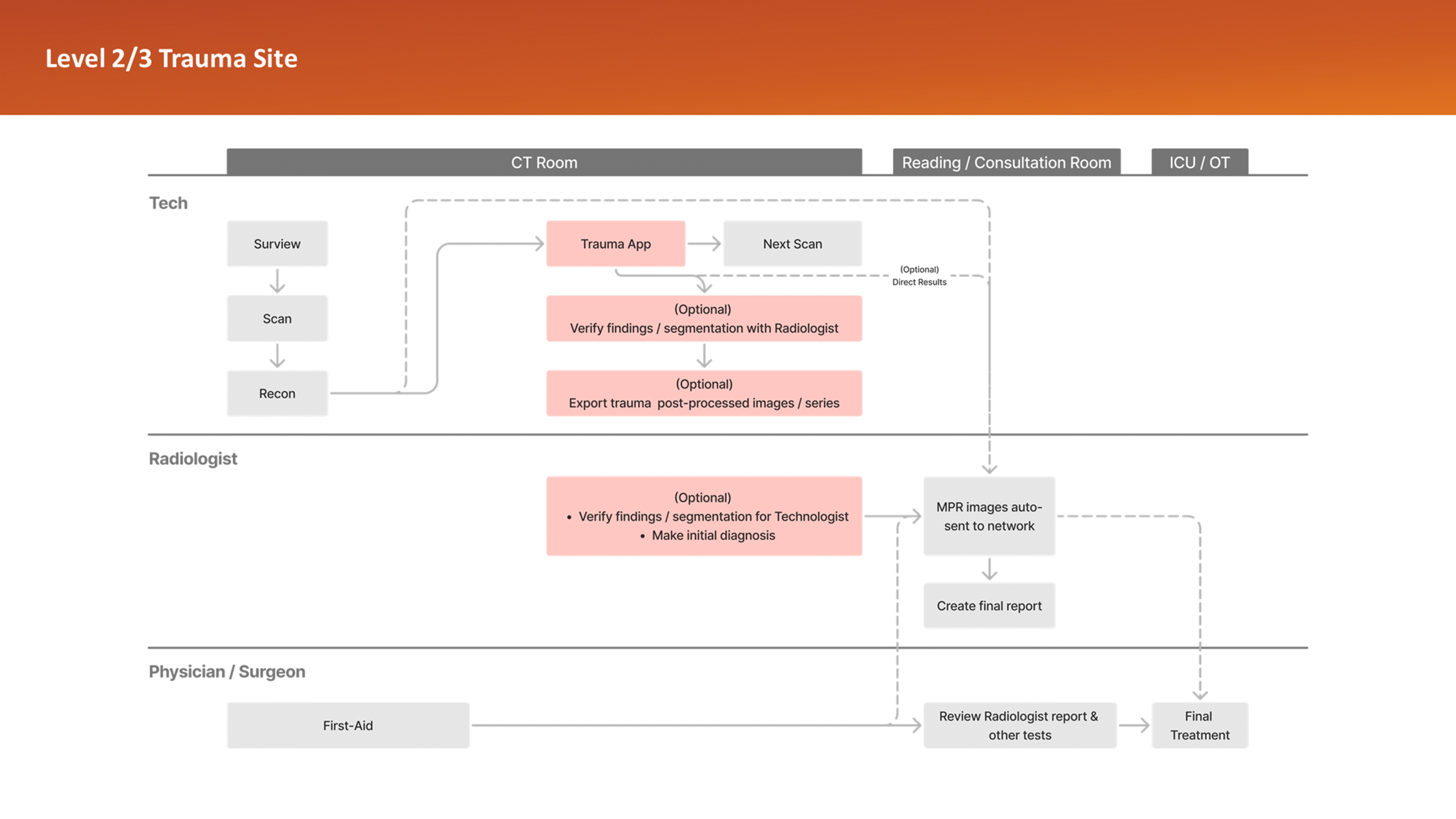 The workflow analysis confirmed a glaring issue: being limited to a CT console system, the application’s primary user was a Tech by default, even though only Radiologists can verify output data. During trauma cases, the CT console is often overcrowded, with multiple users competing for access in a high-pressure, time-sensitive environment. Patient queues at the console further limit opportunities for post-scan use of the application, which could otherwise help reduce user overlap.