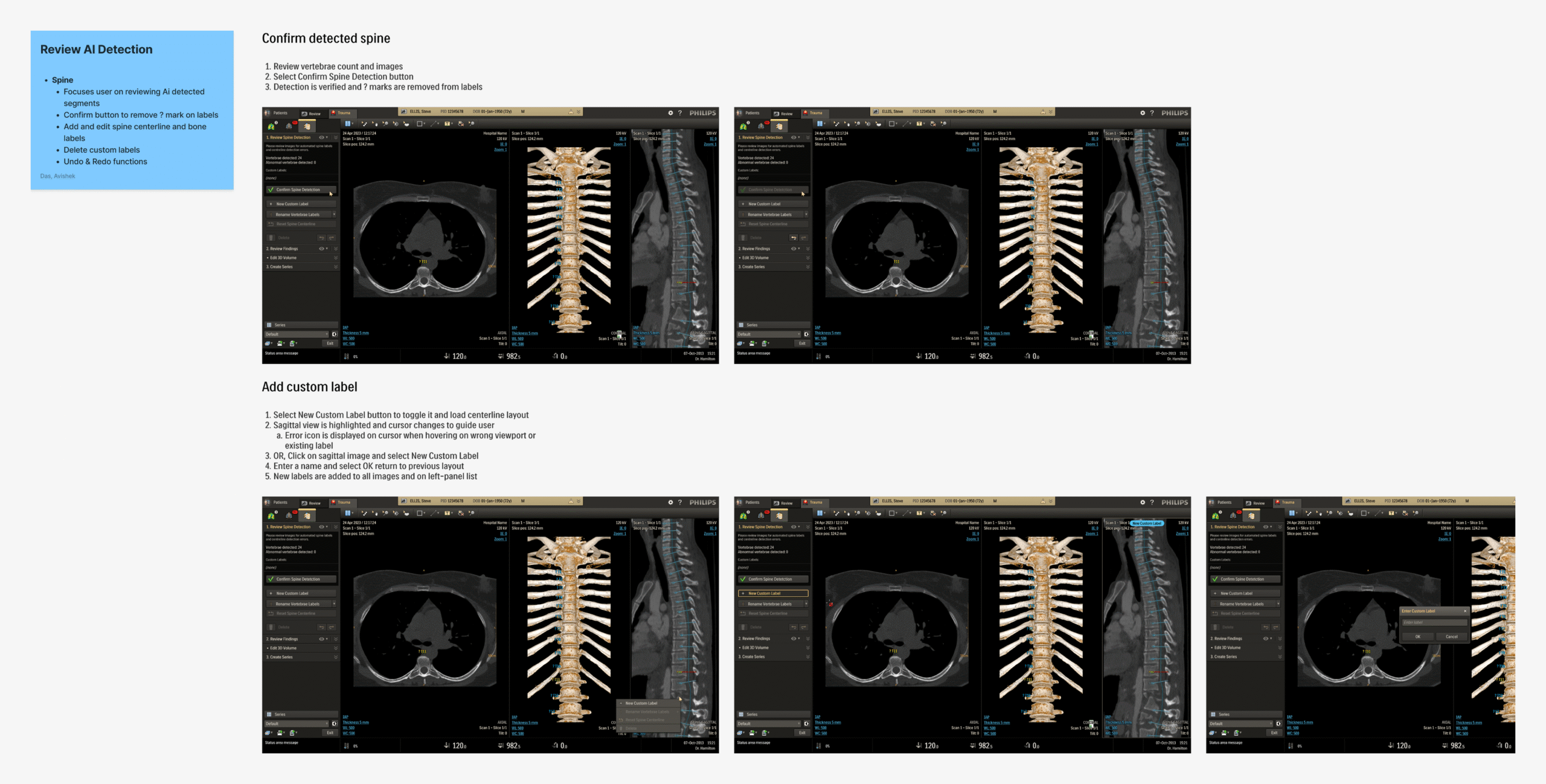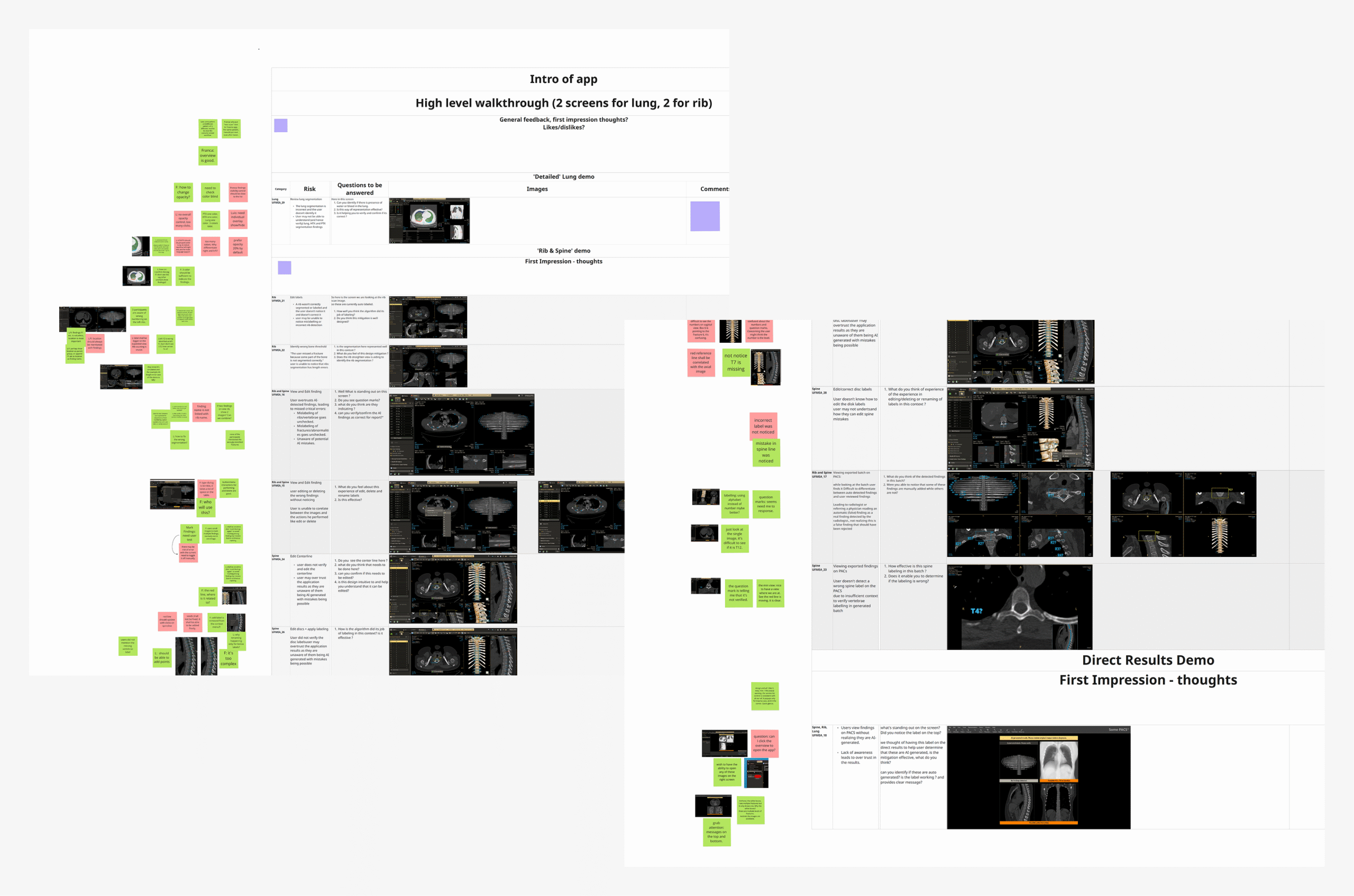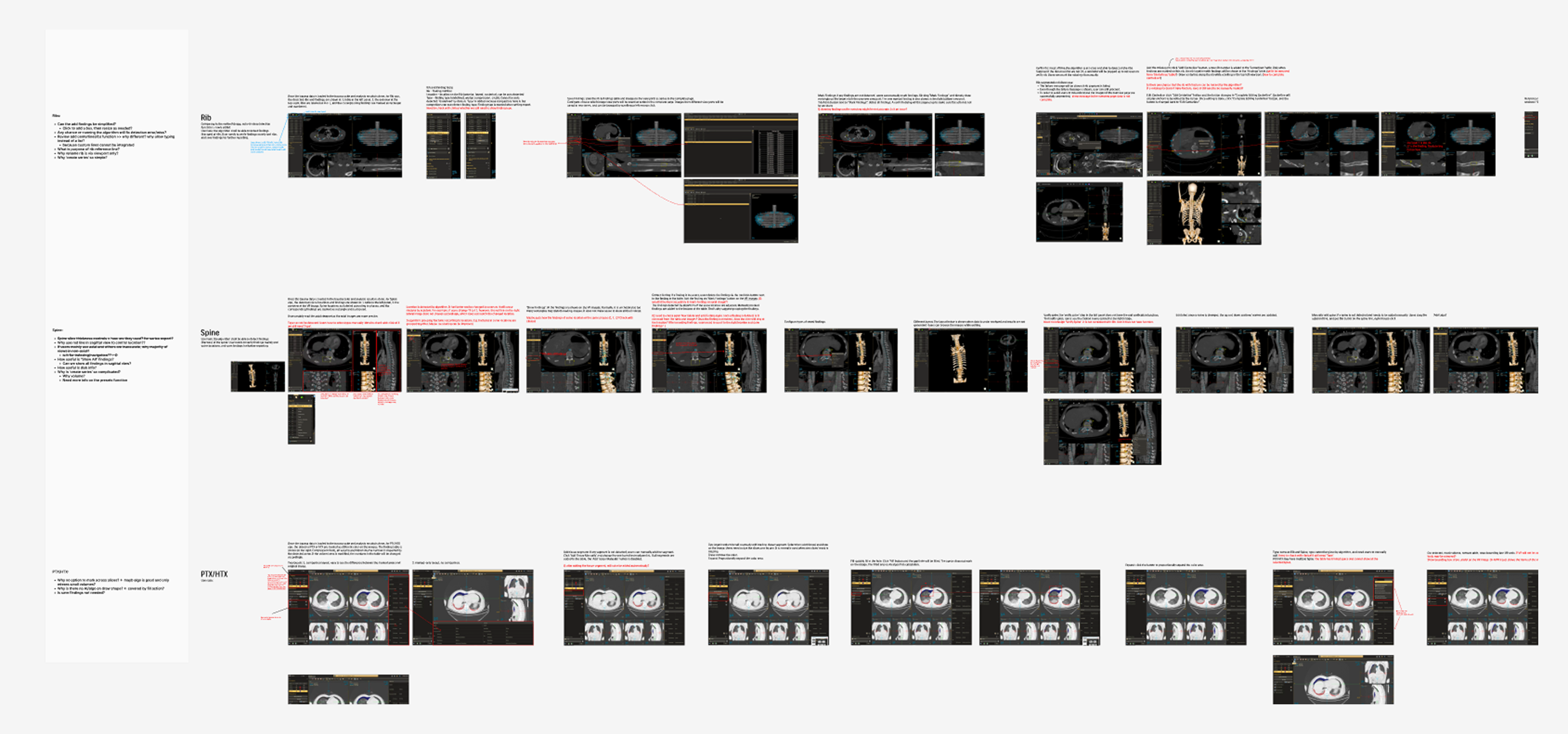 A simplified workflow map and a presentation demo of the planned application features were shared with real users (with the help of colleagues in Europe) and a broader group of stakeholders. Feedback from these sessions confirmed that most users were unsure of features beyond the specialized image and findings generation, such as detailed editing and validation, within the CT room.