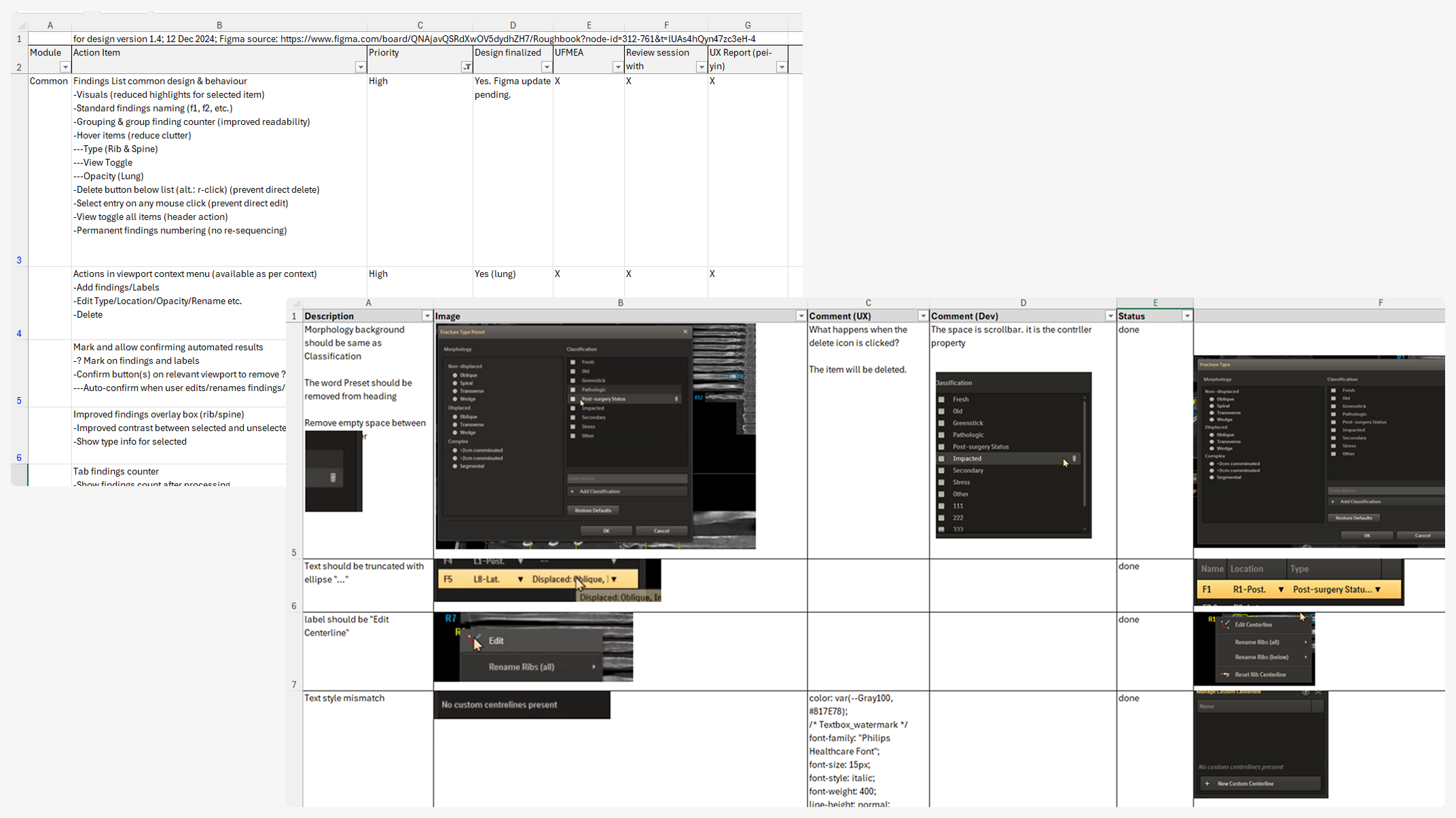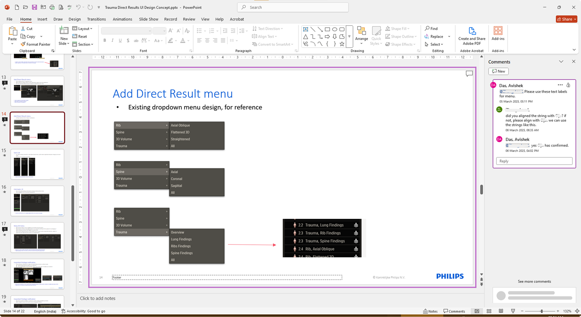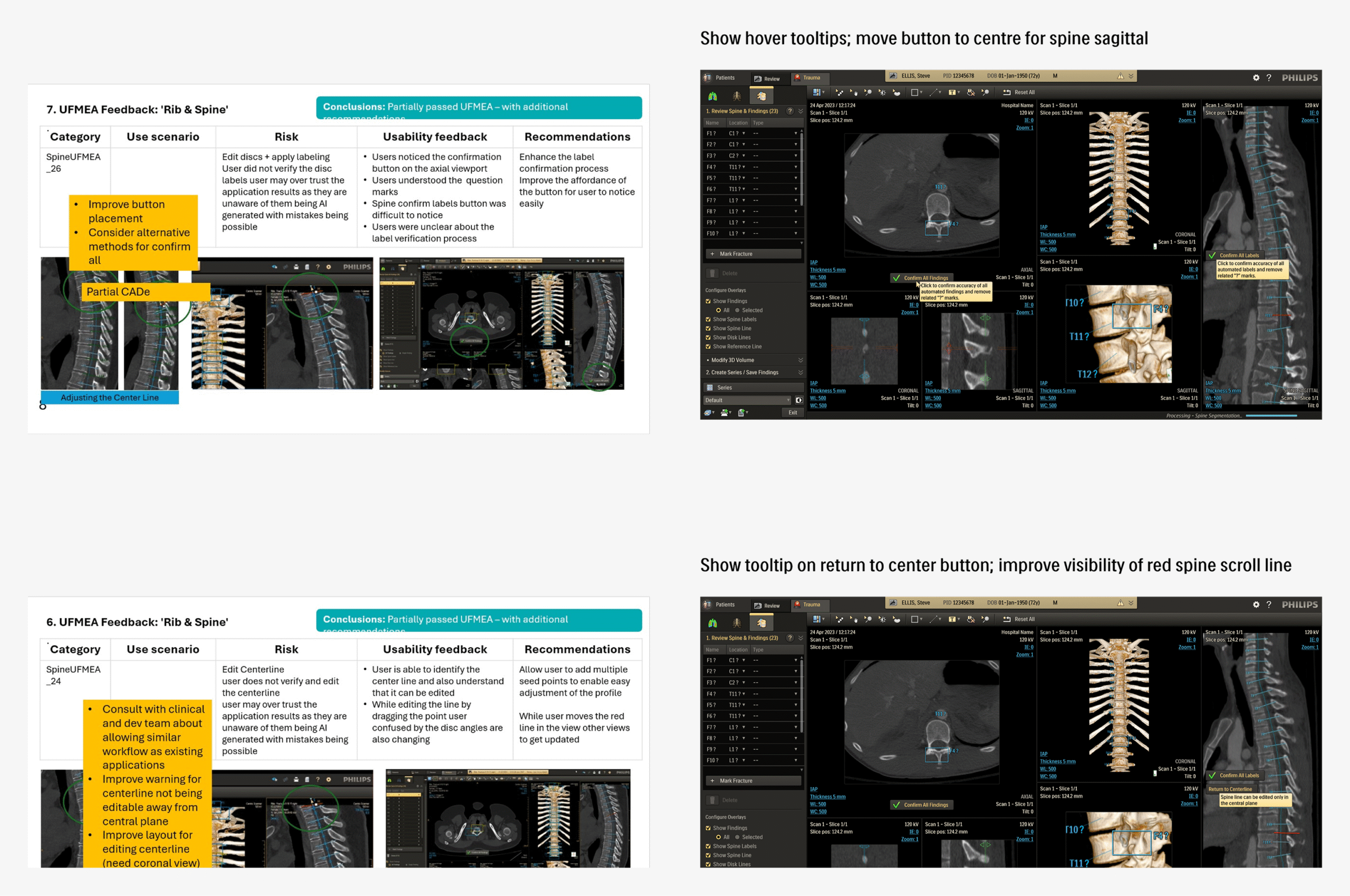 A simplified workflow map and a presentation demo of the planned application features were shared with real users (with the help of colleagues in Europe) and a broader group of stakeholders. Feedback from these sessions confirmed that most users were unsure of features beyond the specialized image and findings generation, such as detailed editing and validation, within the CT room.